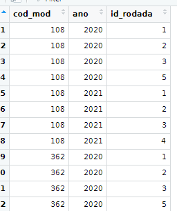 Boa tarde a todos!!! Novamente agradecido pela ajuda anterior, e já pedindo desculpas por nova perturbação, mas de novo apareceu uma situação que não sei resolver. Segue o código R parecido com o outro para baixar dados via URL, onde agora x1 representa o código de modulo de um serviço, x2 o ano e x3 o código da rodada trimestral de realização desse serviço:baixa_bancos<-function(x1,x2,x3){ dados<-read.csv2(paste('http://.../arquivo_m", x1 ,"_a",x2,"_s", x3,".csv'",sep=""),header=T, sep="|", dec =".", encoding = "UTF-8")} A chamada da macro fica algo assim: a<- vetor de código de módulos; b<-vetor de anos; c<-???? for(i in 1:length(a)); for(j in 1:length(b)); for(k in 1:length(c)){x1<-a[[i]]; x2<-b[[j]]; x3<-c[[k]]baixa_bancos(x1,x2,x3)} Coloquei interrogação no vetor c em vermelho por causa da dúvida. Os códigos de módulo e ano (óbvio) são fixos, basta vetorizar. Mas os códigos de realização de serviços trimestrais, identificados por código numérico, podem por conveniência de atraso, não ser iguais, embora sejam sempre quatro. Assim por exemplo: Mód:108;Ano:2020;codserv:1,2,3,5 Mód:108;Ano:2021;codserv:1,2,3,4 Mód:429;Ano:2020;codserv:1,2,3,4Mód:429;Ano:2021;codserv:1,3,4,5 Dessa forma o vetor c depende do código de serviço e do ano em que ele foi realizado. Para me ajudar nisso, o TI daqui me deu uma outra consulta que também baixo por URL, que após alguns ajustes, faço virar uma tabela dentro do RStudio, com essa cara: Resumindo agora: o que eu queria é adaptar meu código da seguinte forma: se viu que o módulo é 108 e o ano é 2020, então ele deve ler como parâmetros para k3 o valores 1,2,3,5; se for módulo 108 e ano 2021, ele deve ler para k3 o valores 1,2,3,4. E assim sucessivamente, até finalizar o baixar das bases de dados requeridas. Eu consegui ser claro? Se sim, alguém saberia como se faz isso? Obrigado novamente pela disponibilidade do time!!! Att, Diogo JerônimoBacharel em Ciências Estatísticas - ENCE/IBGEMestre em Metrologia - PUC-Rio/PósMQIhttp://lattes.cnpq.br/8996149312896520