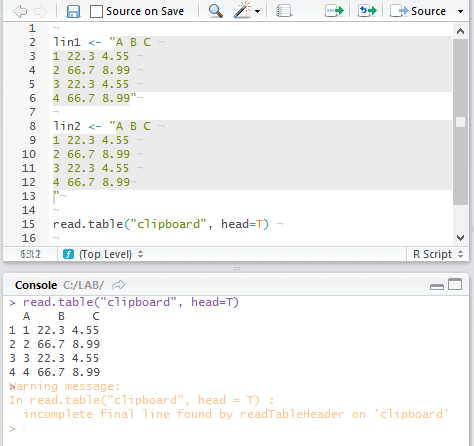 André, bom dia! Eu utilizo o RStudio/Windows, mas consigo reproduzir um "erro" que considero similar ao seu. Observe que há duas seleções de texto na figura abaixo. Elas são ligeiramente diferentes pela segunda forma incluir o line feed (CRLF/LF). Copiando a primeira forma e executando o read.table() obtenho o mesmo aviso. Nesse caso não há maiores problemas, pois sendo um aviso, o comando mesmo assim é executado e retorna os valores. Se você copiar o texto entre aspas de uma mensagem da lista R-br, p. ex., pra utilizar através do "clipboard", deve obter o mesmo aviso. Se for esse o caso, teria que copiar, colar o texto antes de utilizar, dar um enter na última linha, recopiar e aí então utilizar no "clipboard". Na verdade, se você só colar e recopiar no próprio editor de script do RStudio deverá funcionar, porque o line feed já deve estar presente na linha onde você cola. Éder Comunello <c <comunello.eder@gmail.com>omunello.eder@gmail.com> Dourados, MS - [22 16.5'S, 54 49'W]